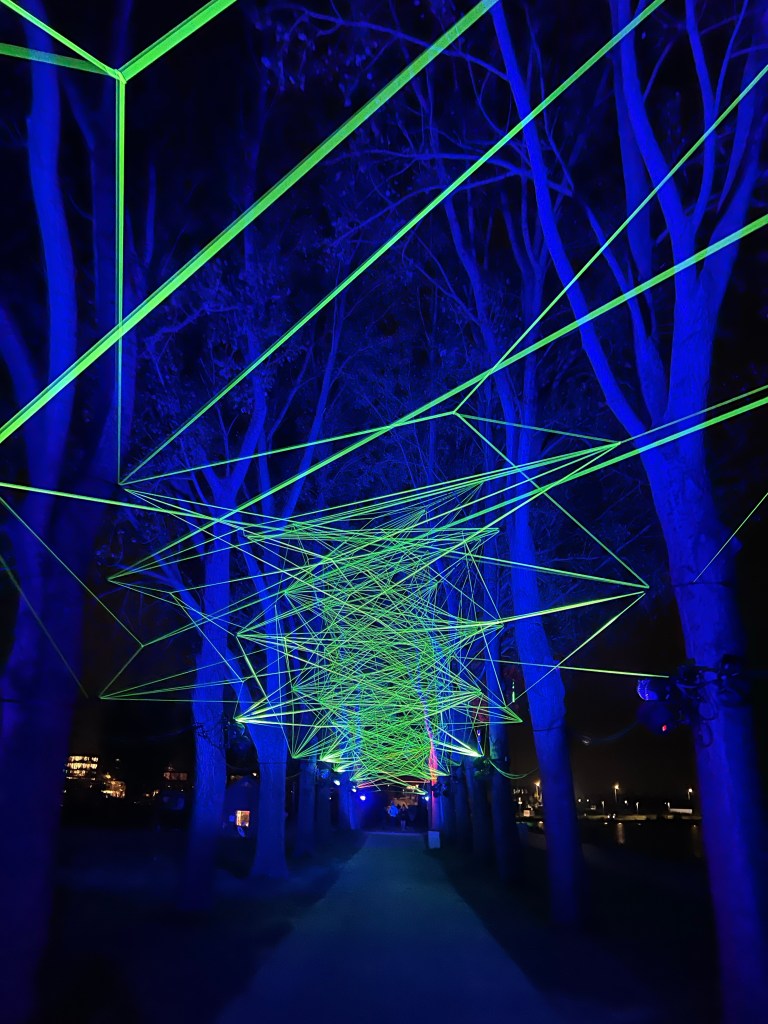 ‘S Avonds wandelden E en ik over het licht festival van Almere. Niets voor rennersbenen, maar wel mooi om te zien.
