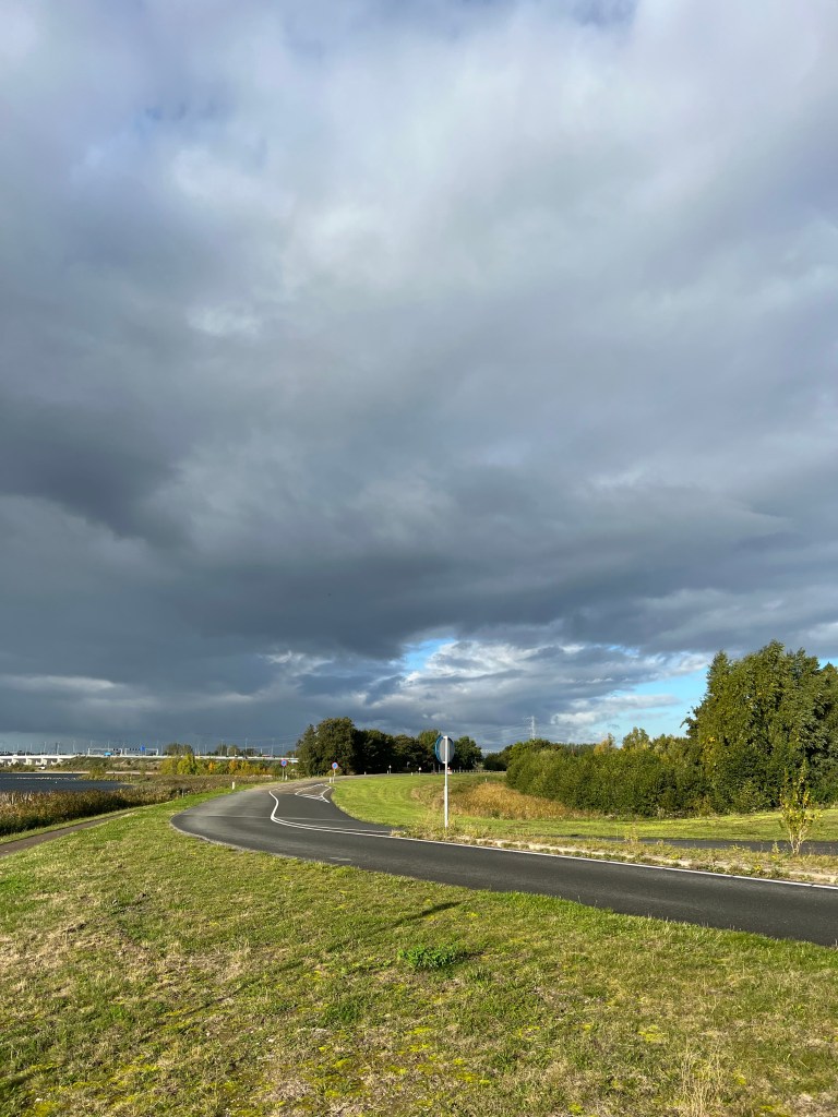 Ik voelde me leeg tijdens het fietsen. Voelde als niets. Daarom echt kort gehouden en over het Spoorbaanpad weer retour. Gelukkig viel de verwachtte neerslag niet op mij. Wel waren de wegen kletsnat. Misschien ook wel de reden dat iets mijn band doorsneed en zo mijn binnenband er uit deed stulpen waardoor deze knalde.